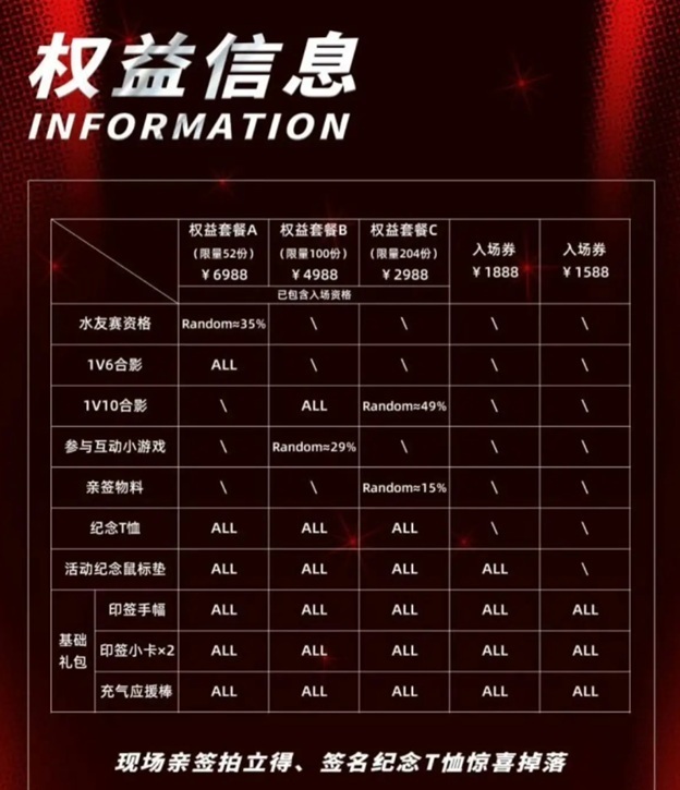 套餐里面包含了很多内容,比如说套餐A(限量52份)可以获得水友赛资格,能进行1v6合影,然后还有很多礼品相送,其他的套餐也有相关的互动内容,看台票则只有一些小礼品相送,结果就是这么贵的天价票,在开售不久之后都被一抢而空了。