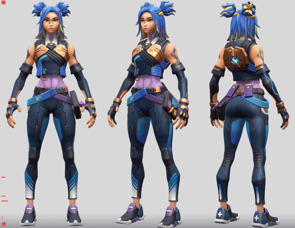 游戏中的英雄设计同样遵循了“为玩法服务”这一理念。每个角色有且只有一两种主题色,在这个基础上,人物的服装、技能、饰品等元素都会紧紧扣着主题色来设计。例如,霓虹的主题色是深蓝,斯凯是草绿,奇乐则是黄色和绿色混搭。这种设计既强化了角色形象,也增加了对局便利度。玩家可以用分辨颜色这种简单有效的方式区分不同的英雄,剔除对局中不必要的干扰。