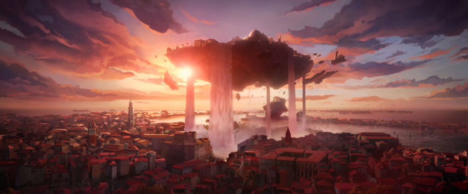 除了角色设计之外,游戏中的地图同样花费了设计师许多心血。我们上面提到,为了竞技性考虑,瓦手地图的主体部分必须保持简洁。而那些地图不可互动的部分,就是设计师展示业务能力的时候了。微风岛屿里阳光穿过棕榈叶的海岛风光、亚海悬城里整座城市漂浮在空中的视觉奇景、霓虹町高低错落的城市设计,都在游戏里恰如其分地呈现了出来。