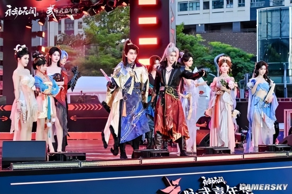走进咏武嘉年华现场,映入眼帘的便是游戏标志性角色“宁红夜”的一座8米高的巨型雕像;其下方宽阔的台阶周围,簇拥着玩家们熟悉的“返魂花”,层层叠叠铺展成一片醒目的红色。
