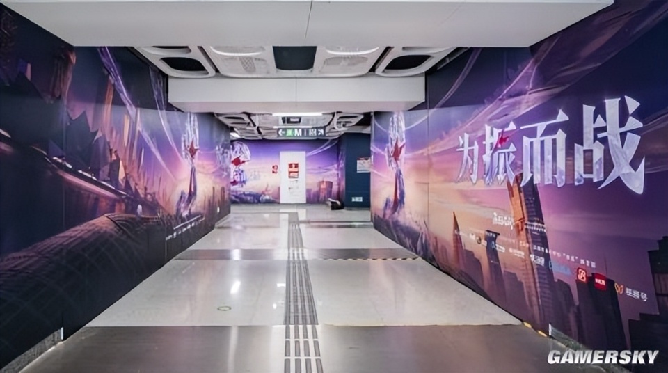 距离赛场最近的地铁出口处,贴满了《永劫无间》与本次赛事的宣传画面。在白色瓷砖的映衬下,一条长达数十米的红色巨幅海报格外醒目,吸引不少路人驻足观望;而临近扶梯出口处,与本次冠军总决赛“为‘振’而战”的宣传标语,又再次铺满整个地铁通道。
