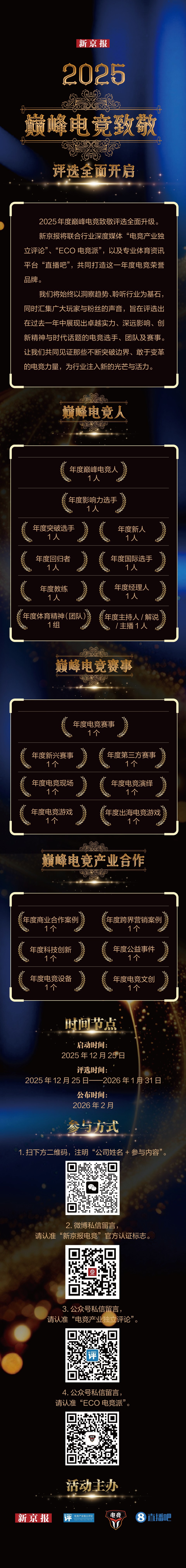 值此岁末,为铭记这不凡的一年,新京报将联合行业深度媒体“电竞产业独立评论”、“ECO电竞派”,以及专业体育资讯平台“直播吧”,共同打造2025年度巅峰电竞致敬这一年度电竞荣誉品牌。我们将始终以洞察趋势、聆听行业为基石,同时汇集广大玩家与粉丝的声音,旨在评选出在过去一年中展现出卓越实力、深远影响、创新精神与时代话题的电竞选手、团队及赛事。让我们共同见证那些不断突破边界、敢于变革的电竞力量,为行业注入新的光芒与活力。