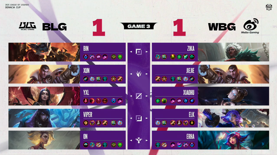第三局比赛,BLG蓝色方,选用:Bin兰博;Xun杰斯;Yxl妖姬;Viper厄斐琉斯;ON芮尔;WBG红色方,选用:Zika狼母;Jiejie杰斯;Xiaohu发条;Elk芸阿娜;Erha妮蔻