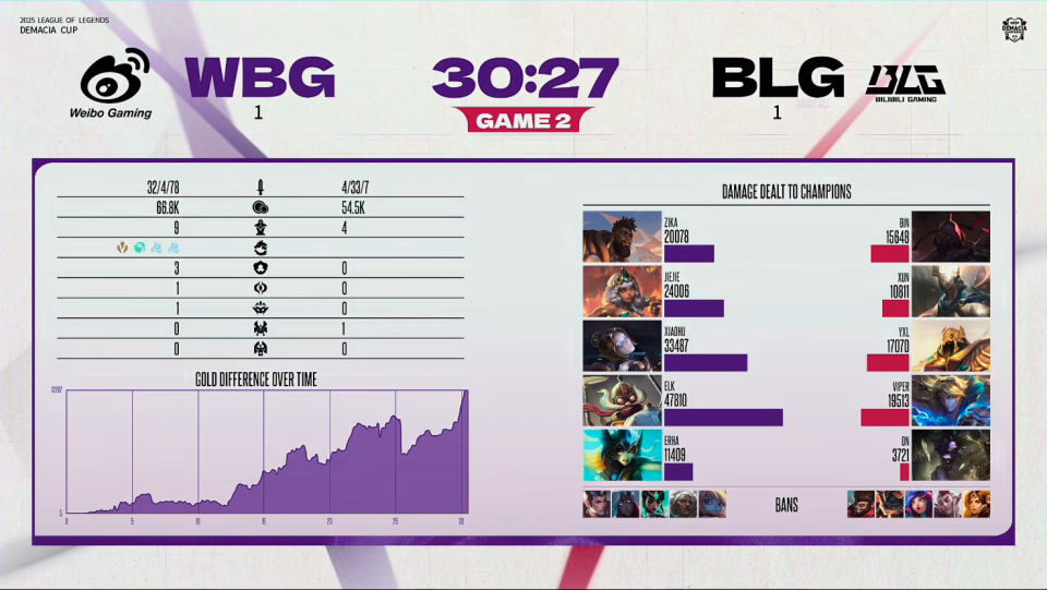第二局比赛,WBG蓝色方,禁用:波比;狼母;卡尔玛;韦鲁斯;赵信,选用:Zika奎桑提;Jiejie奇亚娜;Xiaohu发条;Elk飞机;Erha娜美;BLG红色方,禁用:猴子;兰博;妮蔻;洛;蕾欧娜,选用:Bin塞恩;Xun潘森;Yxl沙皇;Viper伊泽瑞尔;ON牛头