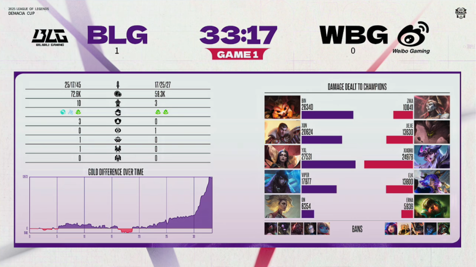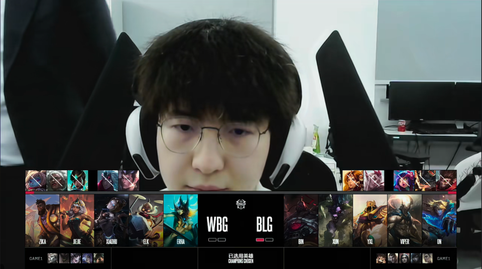 第一局比赛,BLG蓝色方,禁用:波比;发条;塞恩;牛头;阿卡丽,选用:Bin纳尔;Xun杰斯;Yxl妖姬;Viper厄斐琉斯;ON芮尔;WBG红色方,禁用:妮蔻;沙皇;兰博;塞拉斯;烈娜塔,选用:Zika亚恒;Jiejie石头人;Xiaohu辛德拉;Elk芸阿娜;Erha泰坦