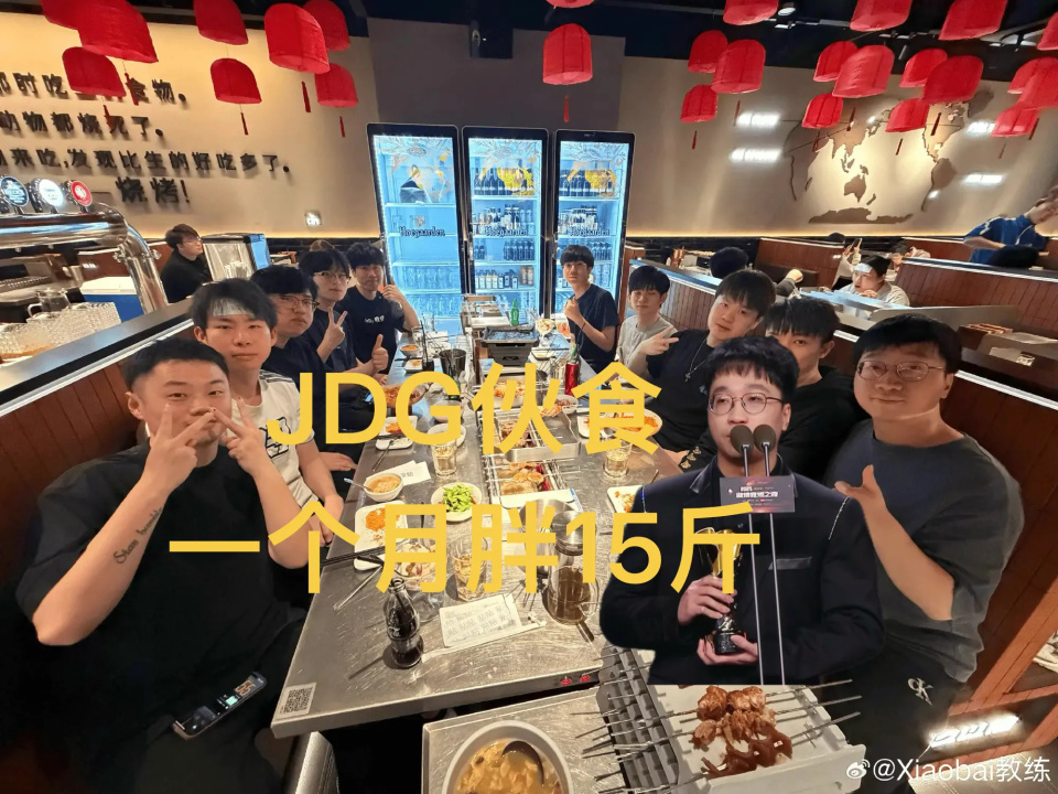 JDG教练一个月胖15斤,赛后晒员工餐,西服都穿不上了