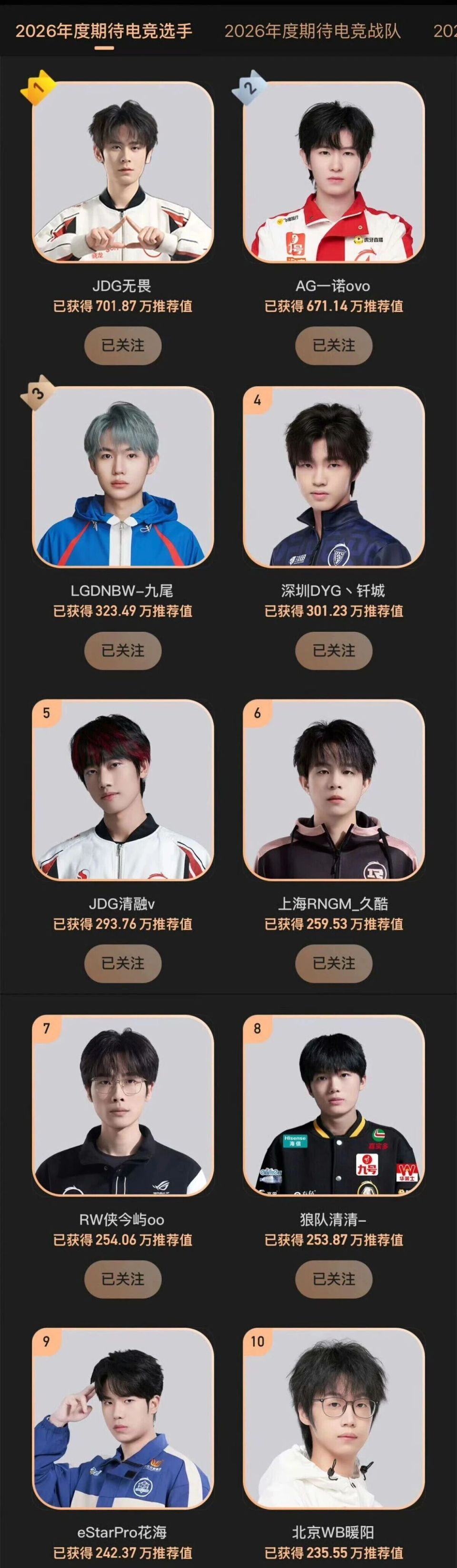 一诺在无畏之下!2026年度期待电竞选手前十:新增今屿久酷,花海还在