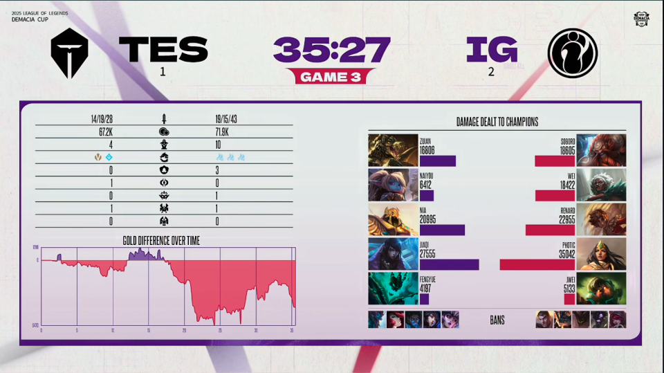 结果第三局比赛,TES完全放弃了自我,选择了IG擅长的方式自杀。17分钟左右,TES中路抱团效果不佳,Soboro酒桶丝滑操作E闪开团助IG团战取胜;20分钟左右,Wei狼母拼惩抢下厄塔汗,随后团战游龙直冲后排拿下双杀;27分钟左右,IG率先拿下大龙,但ZUIAN鳄鱼团战游龙TES完成0换3;最终35分27秒,IG团灭TES,再赢一局。