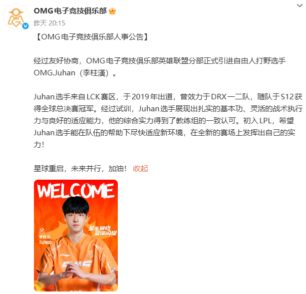 验货成功!OMG官宣正式签下世界冠军韩援打野