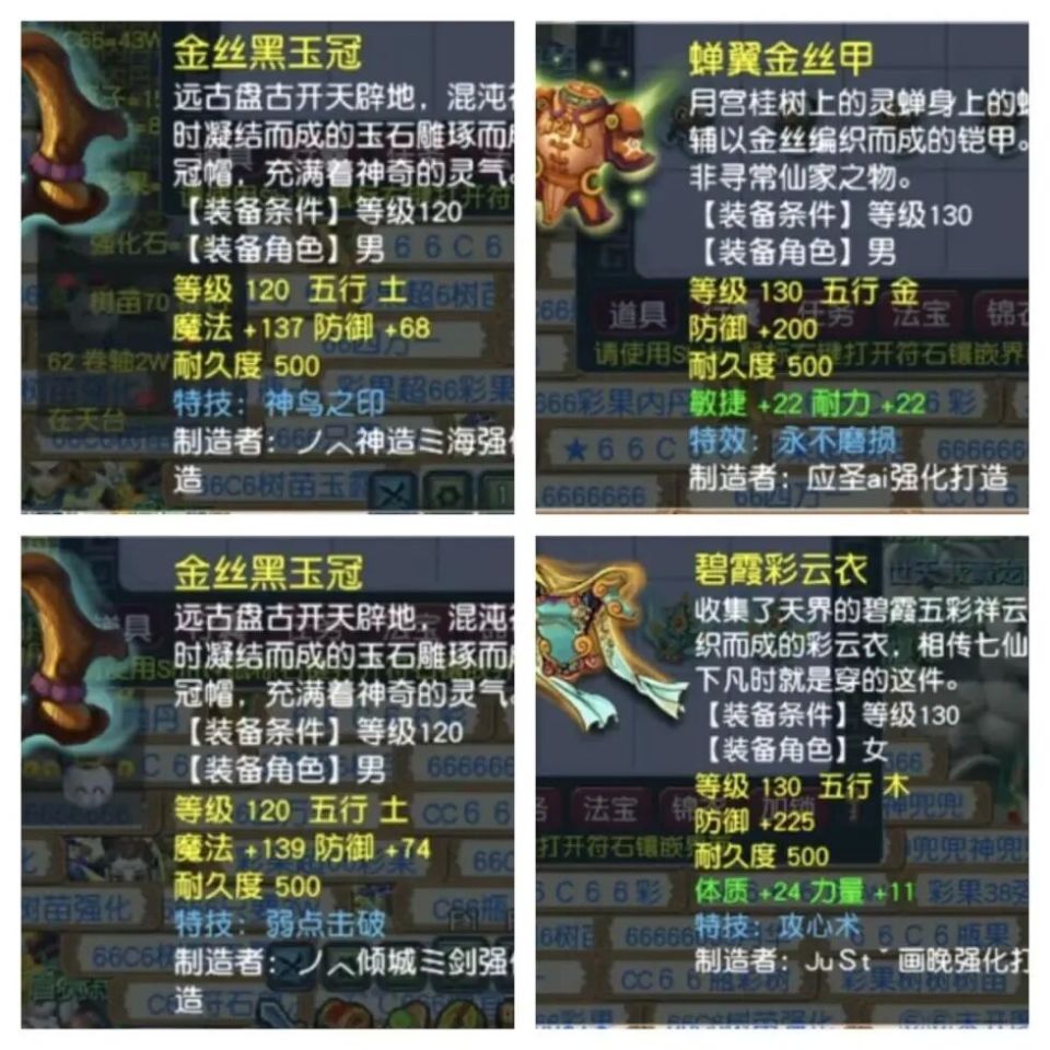 随即,他在齐天大圣服务器开启了自己的鉴定之旅。120-130级武器装备中,陆续跳出几件小极品:一件120级男头,携带“神鸟之印”与“弱点击破”;一件130级永不磨损男衣,防御200,耐敏双加42;还有一件130级女衣,防御225,体力双加35,特技“攻心术”。气氛渐渐热了起来。