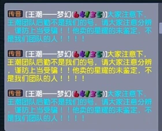 事情始于一个看似普通的“李鬼”事件。有人冒充王潮团队成员,在服务器内售卖未鉴定装备。王潮本人发现后,立即发出传音澄清:“各位兄弟注意,王潮团队后勤号并非我们的人,请大家仔细分辨,谨防上当!他卖的是星耀的未鉴定,与我们无关。”