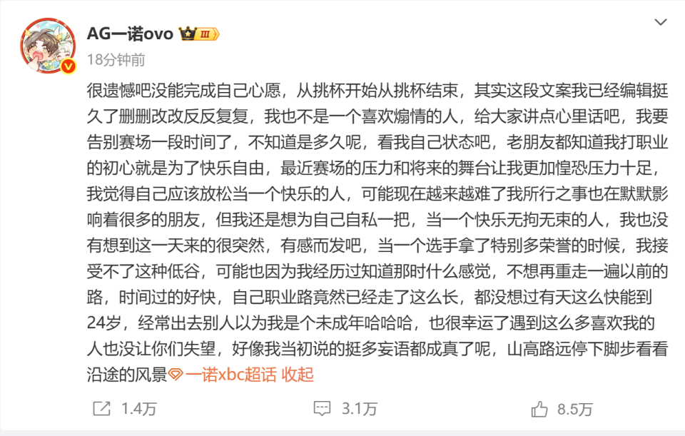 比赛结束之后,AG超玩会的当家明星选手一诺,发文正式官宣“退役”!原文如下:很遗憾吧,没能完成自己心愿。从挑杯开始到挑杯结束,其实这段文案我已经编辑挺久了删删改改反反复复。我也不是一个喜欢煽情的人,给大家讲点心里话吧,我要告别赛场一段时间了。不知道是多久呢,看我自己状态吧。