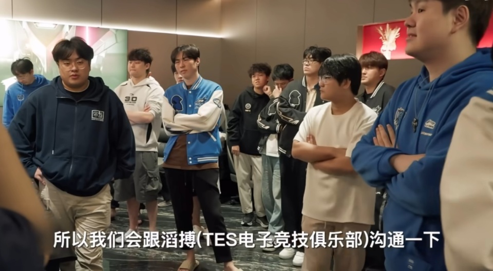 纪录片中,一众陪练团的人神色凝重,旁白则是介绍了当前的局势——现在只有TES一支队伍了,会和TES沟通一下看看他们最后需要哪一队人来帮助他们(打训练赛),要加力度,后面的镜头里面就出现了Elk正在打比赛的画面。