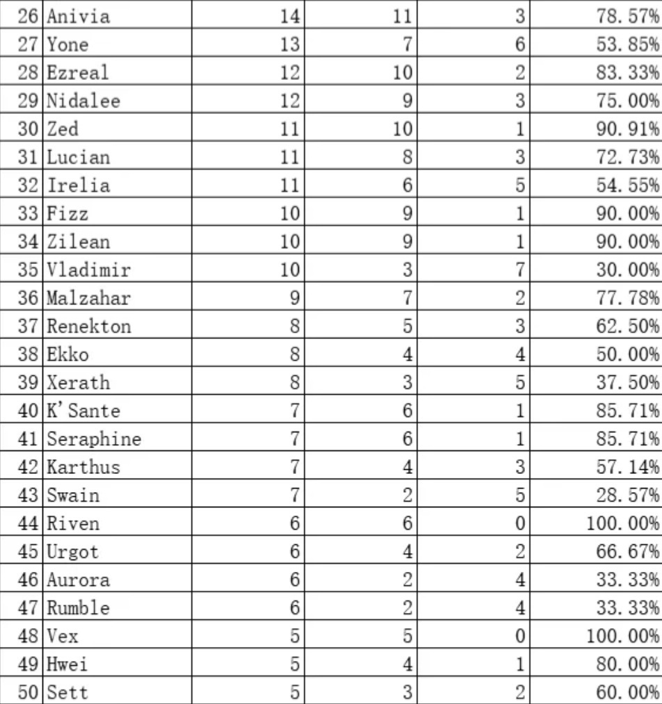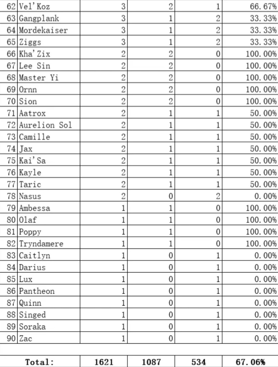 比如说吸血鬼,泽拉斯等等胜率也偏低,基本都属于机制不足主要依赖数值才能登场的英雄,如果说这些英雄重新成为版本强势,登场次数增加的话,Faker应该能很快地将数据提升到正常水平。