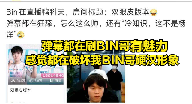 当然在BLG一众选手中,还是BLG上单选手BIN哥最有节目效果,单靠一个标题就直接登上热搜榜单当中。BIN哥在割双眼皮之后,很多观众都想看BIN哥的双眼皮,而近期BIN在直播期间也是专门开启摄像头,并且把自己的直播间改成“BIN哥双眼皮版本”。不少弹幕在看见BIN哥露脸后,都纷纷刷屏表示BIN哥太帅了,甚至不少弹幕调侃BIN哥像杨洋。