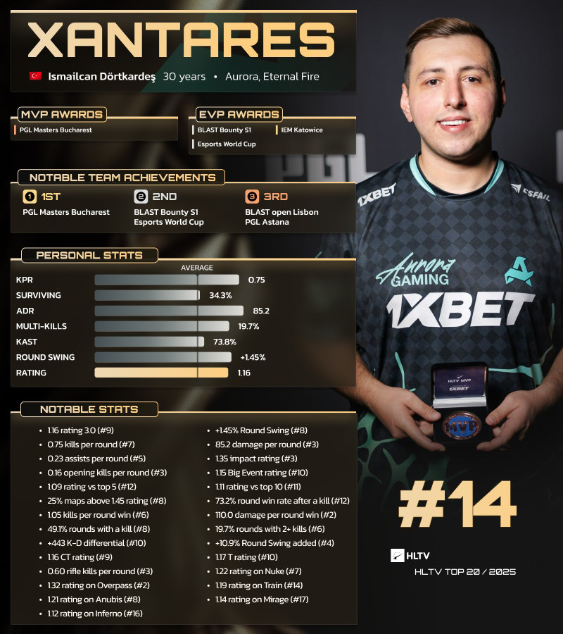 今日凌晨,HLTV正式公布了2025年度TOP20最佳选手上榜的第七位选手,来自Aurora的XANTARES以1.16的Rating,1次MVP、3次EVP、1冠2亚、2次四强的成绩位列今年榜单的第14位。