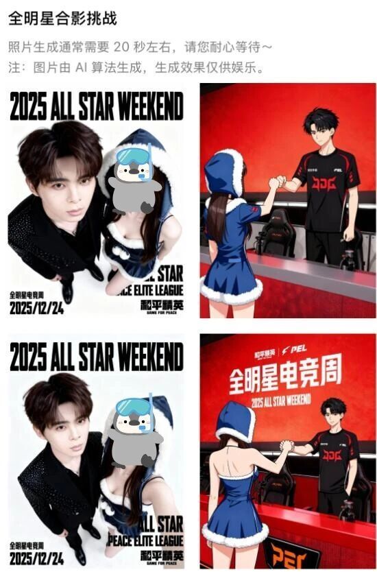 值得注意的是,AI还成为了这次全明星电竞周连接用户的桥梁——《和平精英》定制开发了一个全明星AI合影小程序,在微博上、小红书上都能看到大量玩家分享。他们还做了一组素材,叫#AI视频打开刺激杯新玩法#,用AI让明星选手们“空降量子介”。空投箱降落的场景和动效结合了游戏内沙漠、雨林等特色,选手的动作和表情都相当精致,听说这些选手自己也都挺满意。趣味之余让用户和选手们增加了更多链接和谈资,话题霸榜也就不奇怪了。
