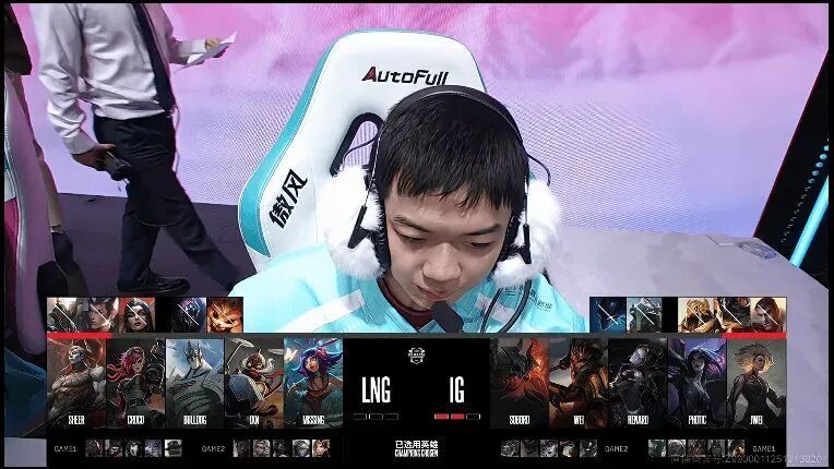 第一局比赛,LNG蓝色分,禁用:奇亚娜、妮蔻、赵信、挖掘机、牛头,选用:Sheer塞恩、Croco猴子、Bulldog狐狸、1xn芸阿娜、missing布隆;IG红色方,禁用:杰斯、发条、兰博、轮子妈、洛,选用:Soboro铁男、Wei狼母、Renard岩雀、Photic韦鲁斯、Jwei泰坦