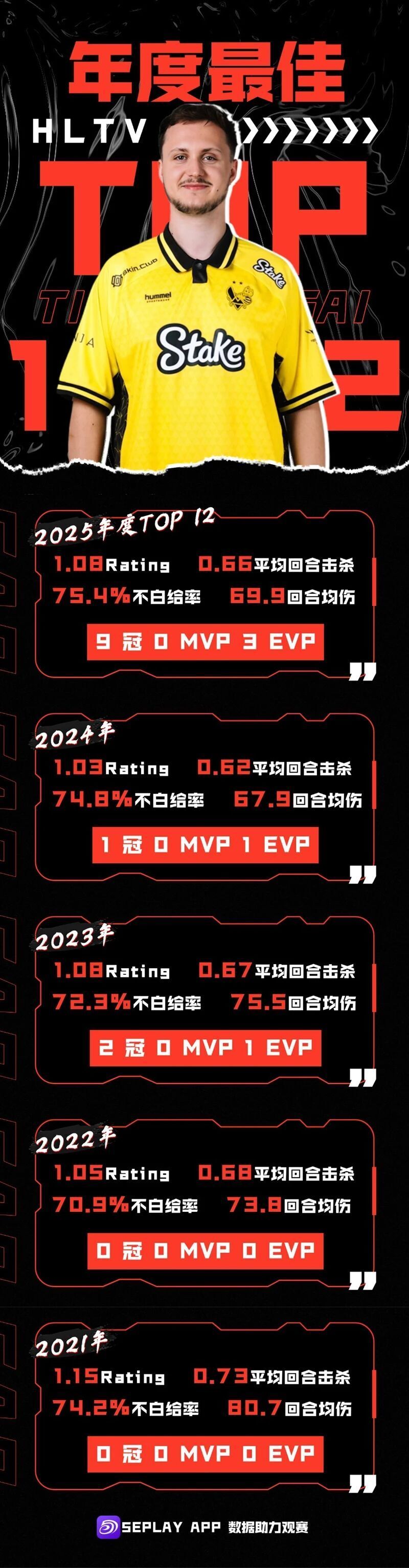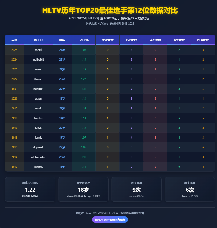 mezii的上榜意味着Vitality将会有四位选手上榜2025年度TOP20,在CS的历史上仅次于2018年的Astralis。那么,从2013年至今,历史上每年TOP20榜单第12位的选手们数据又是如何?