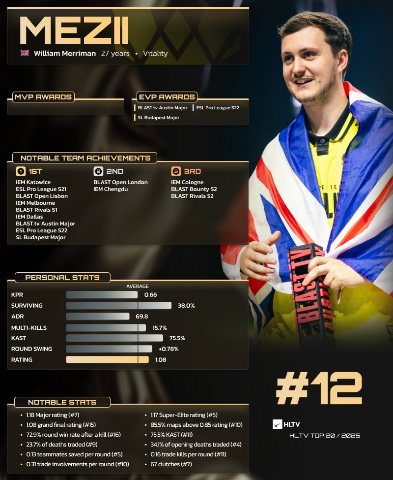 今日凌晨,HLTV正式公布了2025年度最佳选手TOP12的获得者。来自Vitality的mezii凭借其对于Vitality战队2025赛季的辉煌贡献以及在年度超级精英赛事中的表现,以1.08的Rating,3次EVP和全年九个冠军(其中两个Major冠军)的出色成绩获此殊荣。这也是mezii首次跻身年度TOP20榜单。