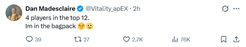 同时,apEX还开玩笑道:“前12名中有4位选手(在我队伍里),我也紧随其后。”