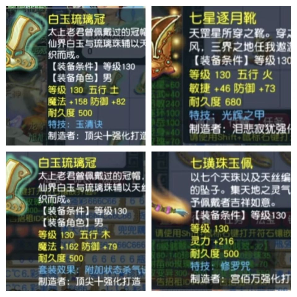 其中出得比较好的就是130级玉清诀的男头,130级的光辉之甲的鞋子,130级的杀气诀的男头,130级216点初灵的项链。