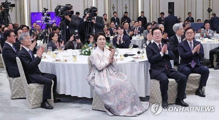Faker和韩国总统与夫人,韩国选举委员会委员长,韩国总理,韩国宪法法院首席大法官,韩国最高法院首席大法官,韩国国民议会议长坐一桌。