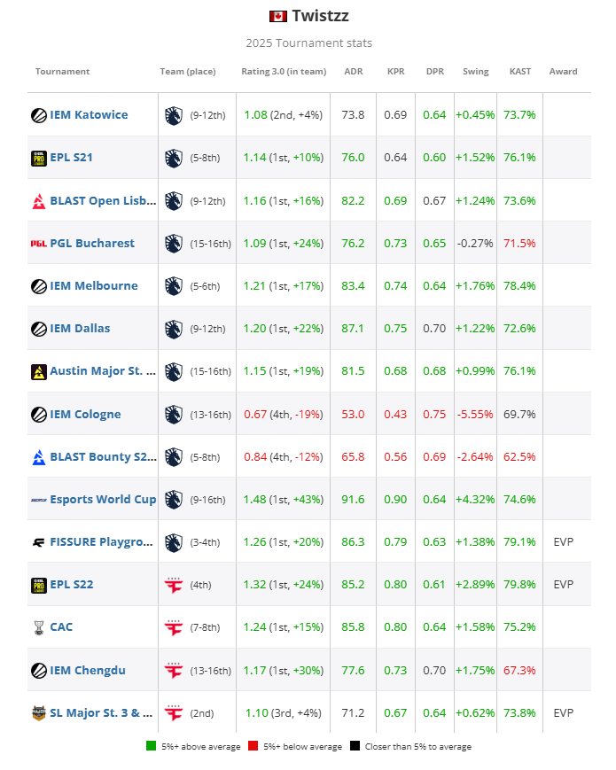 此外,他在精英以上级别的赛事中只有过一次出色的表现,而在超级精英赛事之一的IEM科隆中却出现了全榜最低的低谷之一,使得他在两个类别中的平均rating都位于榜单下游(精英赛事1.07,超级精英赛事1.04)。Twistzz表示: