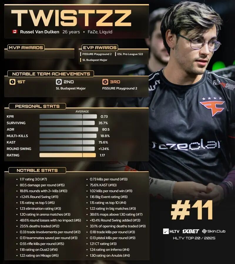 尽管在榜单较为靠前的位置上,他的个人奖项和高水平赛事的数量略显不足,但Twistzz凭借非常出色的统计数据巩固了他第11名的地位,而这些数据本有可能让他获得更高的排名。