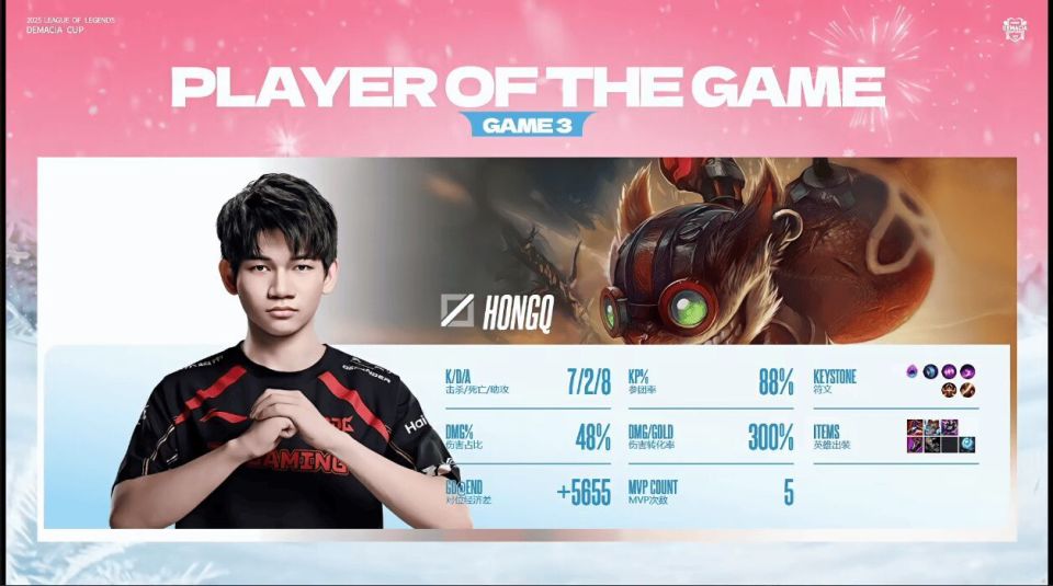 LPL德玛西亚杯,半决赛已经结束了,上一个比赛日,JDG和LGD展开对决,这场BO5用时很短,JDG直落三局,轻取LGD打进决赛,这两队的差距确实不小,尤其是中单位,此前饱受质疑的HongQ,三把都对位完爆汤圆,第三把的炸弹人,更是打出了汤圆,这一整个BO5所有伤害。