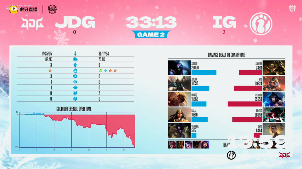 结果第二局比赛,IG又是打出了碾压局。7分钟左右,IG众人目标明确率先集火击杀GALA,随后团战大胜拿下小龙;16分钟左右,JDG率先拿下先锋,但IG团战阵型更优轻松打出2换5团战;20分钟左右,Wei激进站位被秒,JDG抓住机会拿下厄塔汗追回部分经济差;25分钟左右,JDG强行拿下小龙,但IG全员团战操作拉满打出1换5;最终33分13秒,Wei惊才绝景打出“回旋镖”效果,HongQ被秒后IG拿下火龙魂,随后IG推平JDG基地,手握三个赛点。