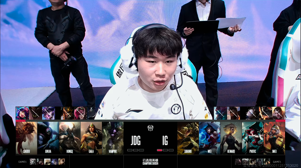 第一局比赛,JDG蓝色方,禁用:妮蔻;石头人;岩雀;辛德拉;波比,选用:Xiaoxu亚恒;Junjia猴子;HongQ沙皇;GALA芸阿娜;Vampire蕾欧娜;IG红色方,禁用:杰斯;兰博;发条;希维尔;烬,选用:Soboro塞恩;Wei狼母;Renard炸弹人;Photic韦鲁斯;Jwei泰坦