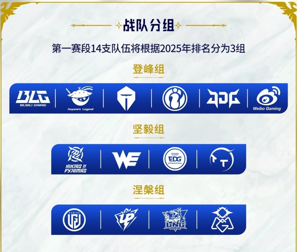 第一赛段,LPL将会把14支队伍分为三个组,根据去年的成绩情况,排名前六的队伍在登峰组,排名7-10的队伍分在坚毅组,而11-14名的队伍则在涅槃组,这个坚毅组的出现也是让观众们笑出声,难道说这个概念是出自哥哥JKL的坚毅眼神?