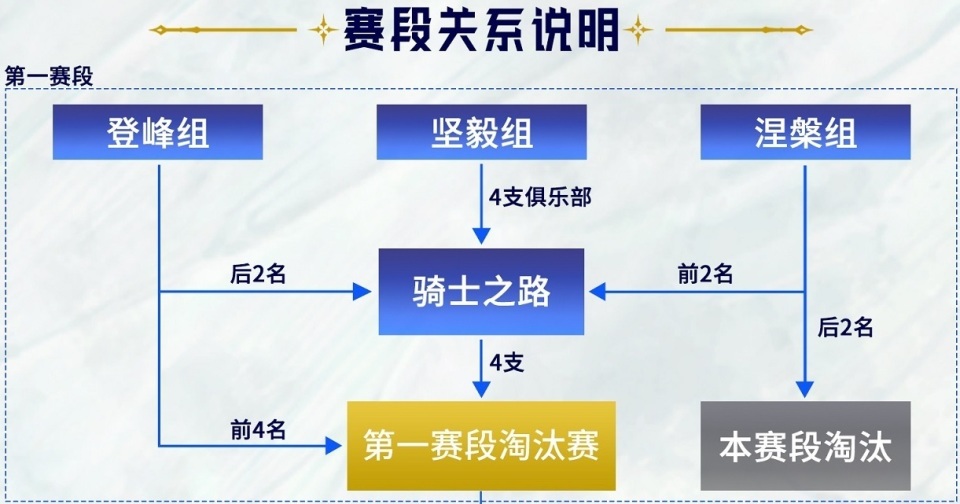 三个不同的组别会根据组内双循环的成绩来决定战队能走多远,会引入两个骑士之路的赛段,决出季后赛的名额。