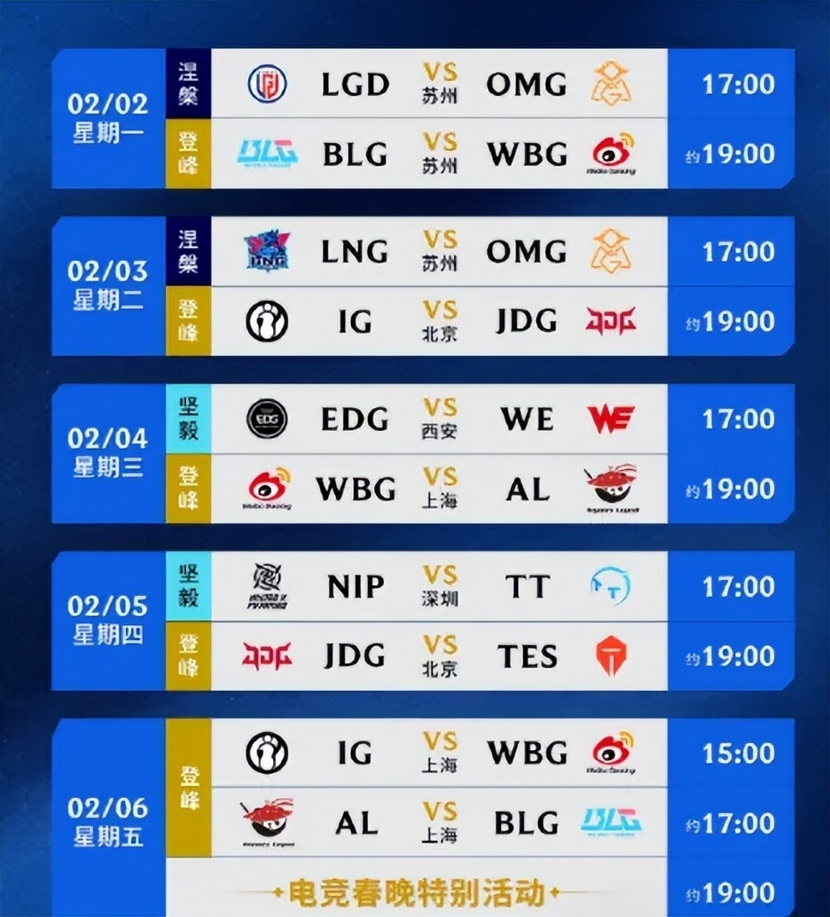 电竞春晚将在2月6号由AL打BLG,这场比赛结束之后,将会带来特别活动。根据相关知情人爆料,这场比赛结束之后将会有表演赛陪伴大家过新年。现在很多粉丝已经开始期待第1赛段的比赛了,毕竟赛制改革过后更加合理,也让所有队友都有了机会。况且在这14支队伍中,并没有哪一支队伍实力特别强劲。中上游队伍其实实力都差不多,所以他们的比赛将会更加激烈,同时竞争也比较大。
