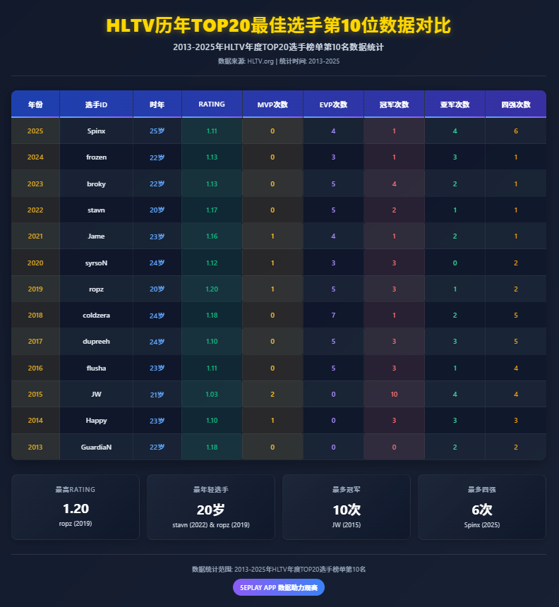 这是Spinx连续第四年进入TOP20榜单,在过去一年中,MOUZ战队频繁亮相各大顶级赛事舞台,而Spinx凭借其极其稳定的高水平发挥,成为团队的重要支柱。那么,从2013年至今,历史上每年TOP20榜单第10位的选手们数据又是如何?