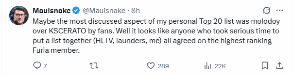 其次是分析师Mauisnake:“我个人的TOP 20榜单中,粉丝们讨论最多的点可能就是我把molodoy排在了KSCERATO前面。不过现在看来,任何花了时间认真做榜单的人(比如HLTV、launders和我自己)都一致同意(我们榜单中)排名最高的FURIA队员是谁。”