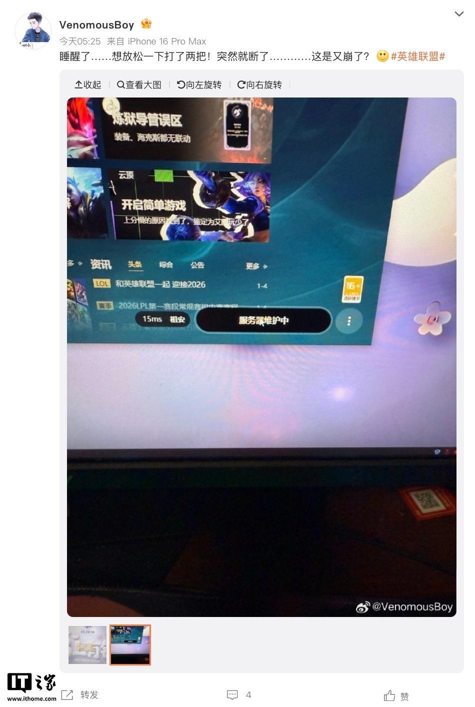 IT之家 1 月 5 日消息,据国服《英雄联盟》官网,《英雄联盟》于今天凌晨 5 点前后对全区进行临时停机维护,维护期间玩家将无法登录游戏,维护开始前已在游戏内的玩家,仍可正常进行游戏。若玩家在中途登出游戏,在维护结束前将无法再次进入。官方称,游戏重新开服时间请留意后续官网公告。