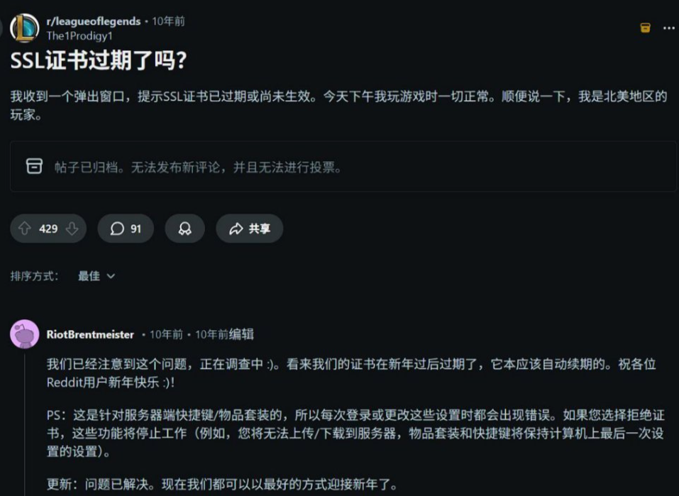 这个停服挺突然挺意外的。以前一般是有版本更新时才停服,并且停服时间是半夜和凌晨,不影响玩家白天玩游戏。但是这一次,白天大部分时间都在停服。解说泽元也调侃:今天是全世界没有LOL的一天了吗?全挂了哈哈哈。停服的原因其实很简单,就是拳头的服务器SSL证书到期,忘了续了。