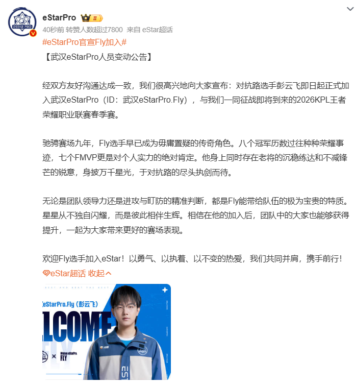 经双方友好沟通达成一致,我们很高兴地向大家宣布:对抗路选手彭云飞即日起正式加入武汉eStarPro(ID:武汉eStarPro.Fly),与我们一同征战即将到来的2026KPL王者荣耀职业联赛春季赛。