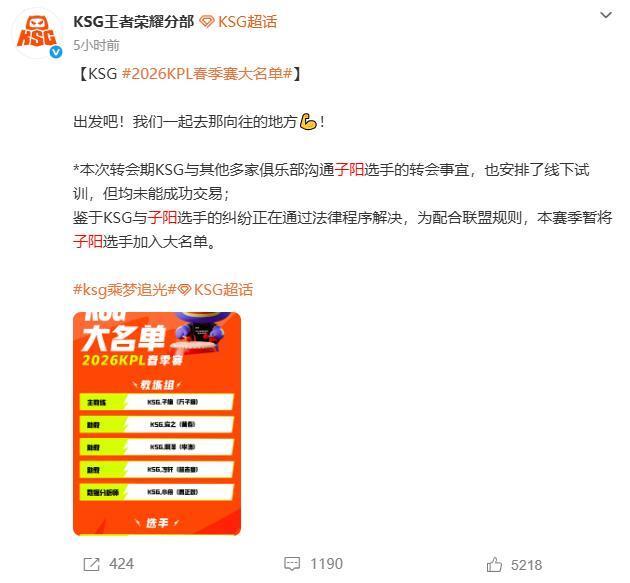 就在今天,各家KPL战队公布了春季赛的首发名单,AG换教练的同时扶持了新人,狼队卖出一笙,选用信+晚星,ES更是大手一挥,签下“对抗路的尽头”FLY。不过,并非所有战队都能那么和谐,就有这样一支队伍,一边发大名单,一边和选手打官司,这支队伍就是KSG。