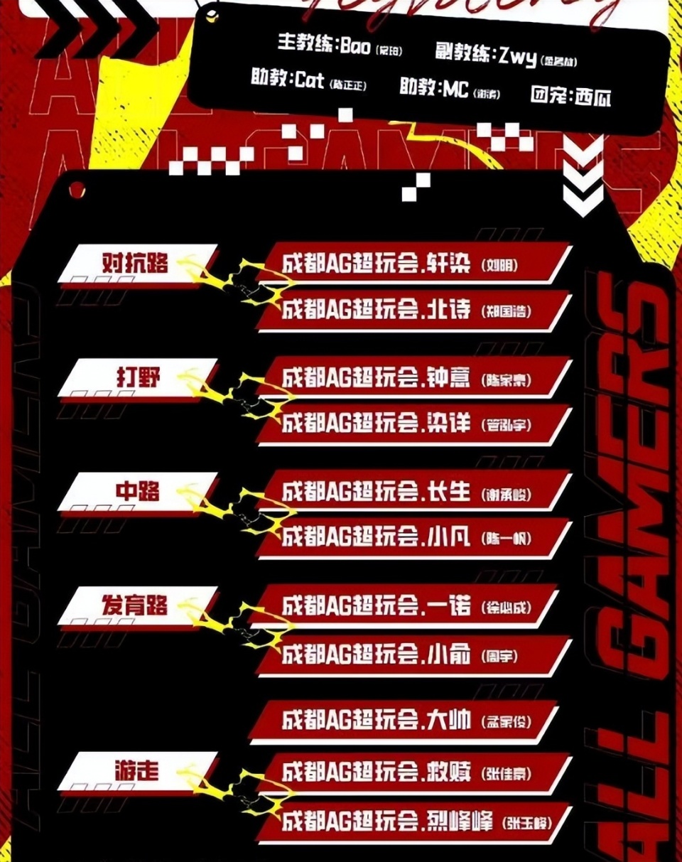 AG大名单是最多的,有11个人,每个位置都有替补。因为中野射休息,春季赛首发大概率是轩染大帅染详小俞和小凡,主教练换成了bao。这套阵容虽然看着没有那么豪华,但在竞争并不算激烈的1组,恐怕只有WB能与之一战,AG拿到一个S组名额应该问题不大。