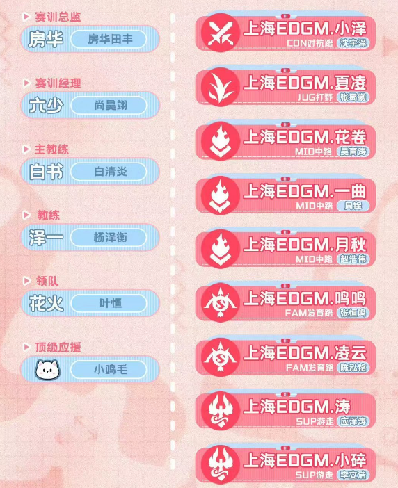 EDGM换了教练,洪洗象变成了白书。原来的辅助笑影和玖痕都解约了,引进的涛可能会成为首发。其他位置应该是花卷,小泽,夏凌和鸣鸣。这套阵容看着竞争力一般,即便是在低手如林的1组,我也不太看好,预测要掉B组。