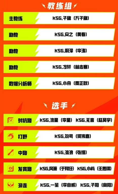 KSG,子阳还在大名单,不过俱乐部说了只是因为没人拍,为了配合联盟规则才放的,言外之意就是肯定不会上场、KSG引进了无言和一笙,应该都会首发,流浪和句号也不会变,新人射手小屿和风箫竞争首发。这套阵容怎么看都觉得竞争力很强,只要磨合不出大问题,应该有四强以上的水准,第一轮预测S组。