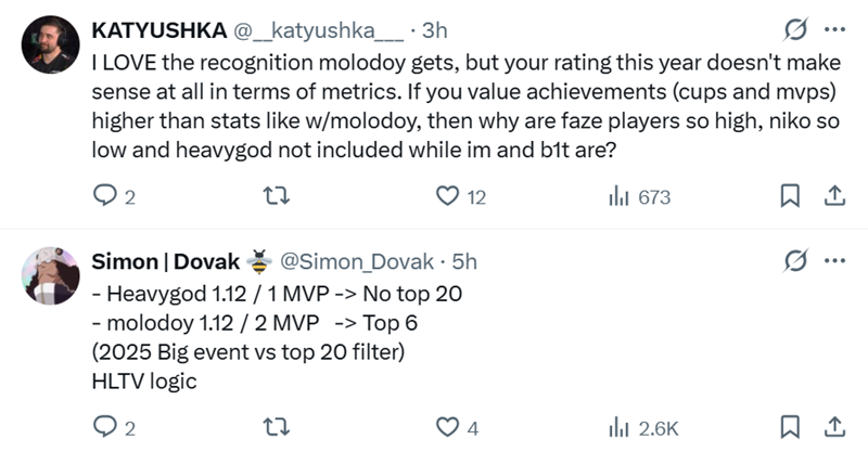 “HeavyGod以1.12 rating和1次MVP未进TOP20,molodoy以1.12 rating和2次MVP却排名第6(基于2025年大型赛事对阵TOP20战队的筛选数据)。这很符合HLTV的评选逻辑。”