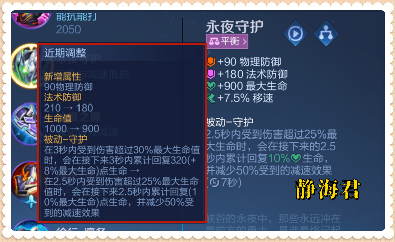 永夜守护同样是加强,除了新增了90点物理防御值不说,守护被动的触发条件和实际效果也都有了大加强(触发难度降低,且新增一个减少50%受到的减速效果)。