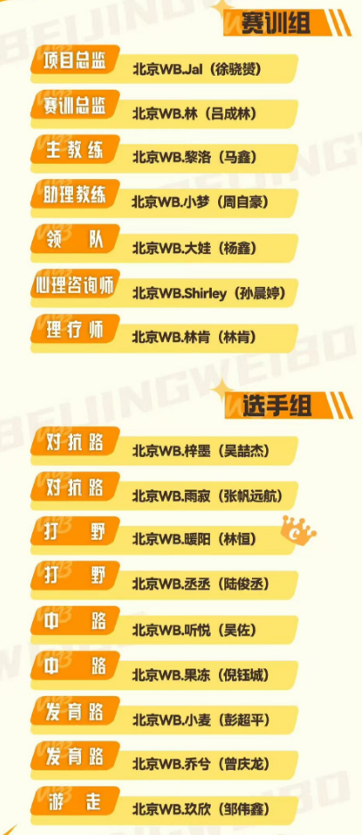 北京WB,唯一的变化就是主教练黎洛上台,老林当赛训总监,基本上就是没变化。挑杯刚刚夺冠的五人组肯定还是首发,一般来说选手拿了冠军,心态会有质的变化,都会更加自信,WB第一轮所在的A组只有AG一个强队,进入S组没有悬念。