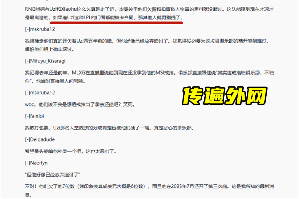 对于RNG的一整个发展史,巅峰期的他无疑是成功的,但由于卡合同、欠薪事件的曝光,还逼退了不少选手,令其风评一降再降。这不,在RNG官推宣布退出后,外网就没给半点好评价,论坛中都在热议RNG卡合同一事。玩家认为:RNG能够拥有Uzi和小虎这么久真是走运,队伍黑料一直没断,能够撑到现在才凉是最离谱的,如果连Uzi这种LPL的门面都能被卡合同,那其他人就更别提了。除此之外,外网对于RNG与香锅、Uzi等人的官司事件也都十分清楚,真就传遍了整个论坛。