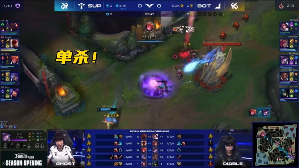 Scout节奏起飞,直接把中下路抓崩,比赛22分钟结束,打野队一个正战绩没有,Oner轮子妈最惨,0-9直接超鬼,第二把辅助队,和AD展开较量,开局2分钟,小K在中路单杀Teddy,拿到优势之后,配合打野疯狂游走,又帮下路建立优势,但AD队的韧性很强,中期又靠团战打了回来。