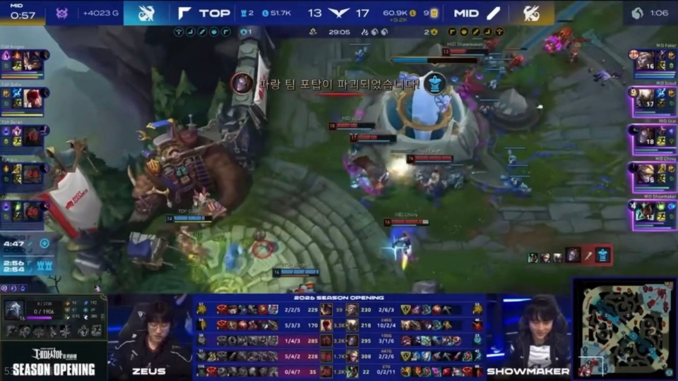 最后一把是中单打AD,这把Chovy被针对惨了,Smash住在下路,开局3分钟就抓死双人组,不过后续的Gank被反蹲了,大超卡莎连拿2个头,扳回前期劣势,打到中期,中单队依旧落后,16分钟人头比13:6,AD队经济领先3.6K,但Chovy这把太猛了,团战疯狂操作,直接带队翻盘了。